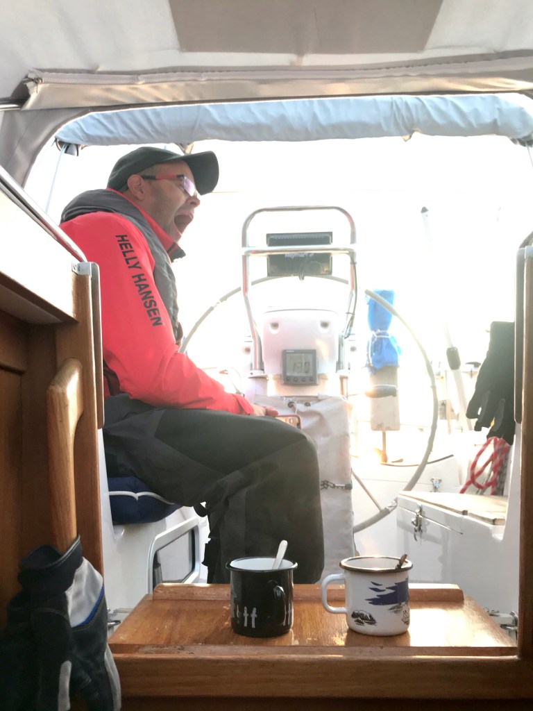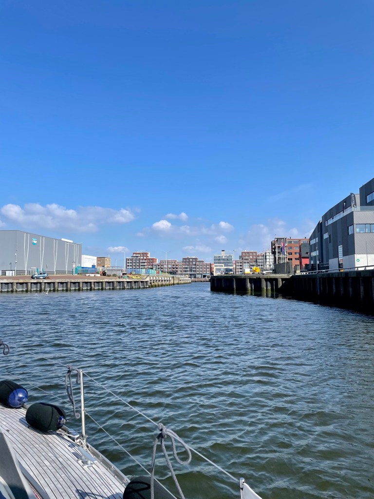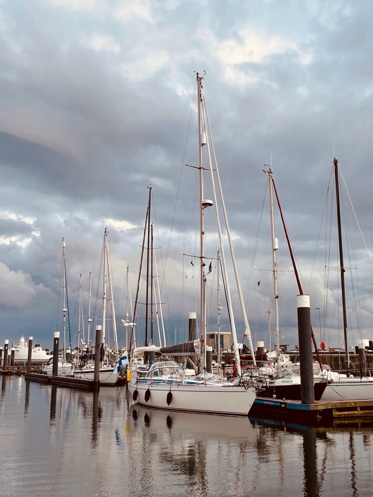 Aamulla nousuvedet ja virrat menivät niin, että kello oli soimassa klo 5:30 ja nopeiden aamutoimien jälkeen köydet irtosivat klo 6:15. Aamupala nautittiin vauhdissa. Liikkeellä oli aikaisesta lähtöajasta huolimatta jo kalastusveneitä ja useampi sotalaiva, joita ihmeteltiin syönnin lomassa. Merellä meitä kutsuttiin VHF:llä ja kutsujana oli suomalainen pariskunta, jotka tulivat vastaan matkalla pohjoiseen. He olivat palaamassa Välimereltä Suomeen ja olivat nähneet meidät AIS:ssa. Oli mukava jutella suomeksi VHF:ssä ja kuulla muista suomalaisista. Emme ole nähneet ketään suomalaisia reissun päällä. Parin tunnin moottoroinnin jälkeen tuuli nousi ja vieläpä juuri sopivasti lännen puolelta. Emme olleet päättäneen, jäämmekö IJmuideniin vai jatkammeko Scheveningeniin, mutta tuuli oli niin hyvä, että päätimme jatkaa.