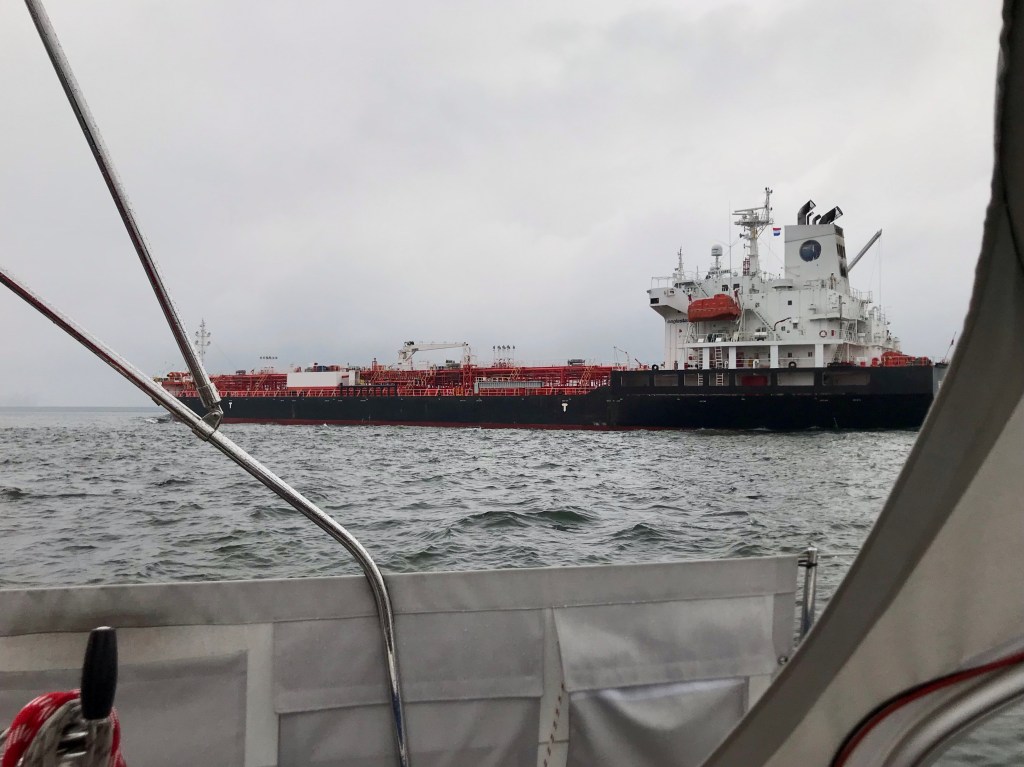 Jouduimme moottoroimaan koko päivän. Sää oli vaihteleva, vähän sadekuurojakin tuli ja näkyvyys oli aika ajoin heikko. Vaikka ei päästy purjehtimaan, päivä oli jännittävä, koska jouduimme ylittämään Euroopan vilkkaimpaan Rotterdamin Europort-satamaan menevän laivaväylän. Väylä piti pienveneiden ylittää tietystä kohtaa ja pyytää lupa ylitykseen VHF:llä VTS-keskuksesta. Laivoja tuli satamasta ulos ja meni sisään jatkuvalla syötöllä. Saimme luvan ylitykseen ja väistelimme laivoja. AIS:sta oli kyllä suuri apua arvioidessa, ehtiikö laivan editse. Kesken väyläajon VTS kutsui meitä VHF:llä. Kun vastasin kutsuun, jostain syystä heidän ohjeensa eivät kuuluneet, koska VHF-yhteys pätki niin kovasti. Tapio ruorissa teki omat päätöksensä ja väistä paria rahtilaivaa perän puolelta. Pääsimme lopulta onnellisesti laivaväylän yli.