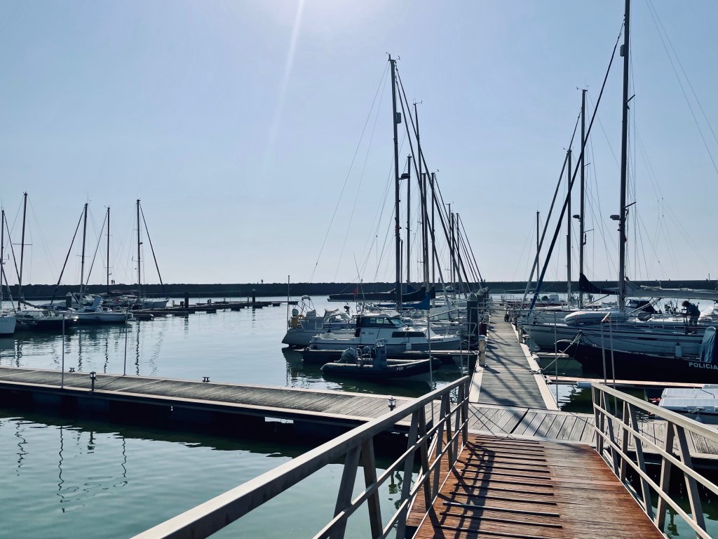 Tiistaina aamulla satamatoimiston auettua kävimme kirjautumassa sisään satamaan ja uuteen maahan. Nyt vene saakin olla samassa satamassa hiukan pidempään, puolitoista viikkoa. Mukavaksi yllätykseksi satamamaksuun saikin mittavan 50 % alennuksen, koska osallistumme ARC:hen. Satamatoimiston mies oli oikein ystävällinen ja puhui hyvin englantia. Saimme luvan siirtää veneen varsinaiselle laituripaikalle. Satamassa kulku sisään saniteettitiloihin ja laitureille on biometrisellä tunnisteella, sormenjäljellä. Kätevää, kun ei tarvitse pitää avaimia mukana tai muistaa koodia. Sää oli tyyni, joten kapteeni katsoi, että Marian on sopiva hetki harjoitella rantautumista. Vene saatiin laituriin vaurioitta, mutta Maria ei oikein ollut tyytyväinen suoritukseensa eikä saatuun ohjaukseen. Päivä pidettiin lepo/veneenhuoltopäivänä. Vuodevaatteet tuuletettiin, vene imuroitiin ja pyyhittiin pilssejä ja lattian turkkilevyjä myöten. Kävimme myös ottamassa ensikokemuksen portugalilaiseen ravintolatarjontaan ihan Mäkkärissä, joka oli kauppamatkan varrella. Ruokajuomaksi olisi saanut halutessaan olutta, ei otettu. Reissulla kävimme potkulaudoilla ja Portugali osoittautui huonoksi potkuttelumaaksi. Jalkakäytävät olivat ahtaita ja tehty pienistä nupukivistä, joten meno oli möykkyistä ja hidasta. Ruokakaupassa kuivatut kinkut olivat vaihtuneet kuivattuun turskaan, jota oli pinottuna kaupassa ilman mitään sen kummempaa käärettä.