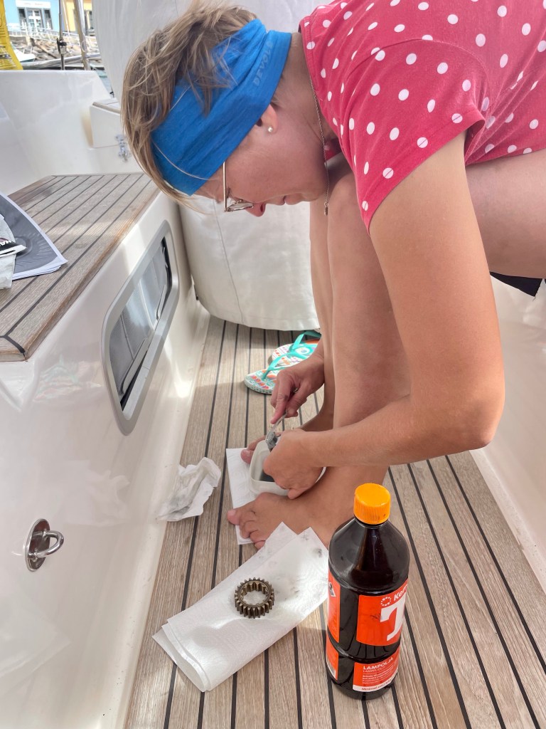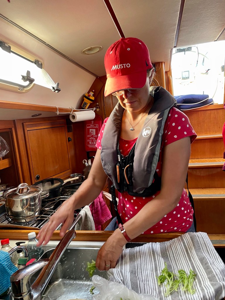 Olisimme jo valmiita lähtemään, mutta tuuli on sen verran puuskaista, että päätimme odottaa vielä lauantaihin. S/Y Zelda sen sijaan irrotti jo köydet ja lähti Desertassaaria kohti, joten tiemme eroavat hetkeksi parin viikon eskaaderitoiminnan jälkeen. Me sen sijaan pesimme vielä lisää pyykkiä ja kävimme läheisellä kukkulalla ja rannalla pienellä kävelyllä. Rannassa olikin mukava pieni rantakahvila, jonka terassilla lepuutimme tovin jalkoja ja viilensimme oloa jäätelöllä ja limulla. Illalla kokkasimme kylmäsavulohipastaa ja katselimme suoratoistopalvelusta TV:tä, että ei jäädä ihan ulos suomalaisesta kulttuurista.