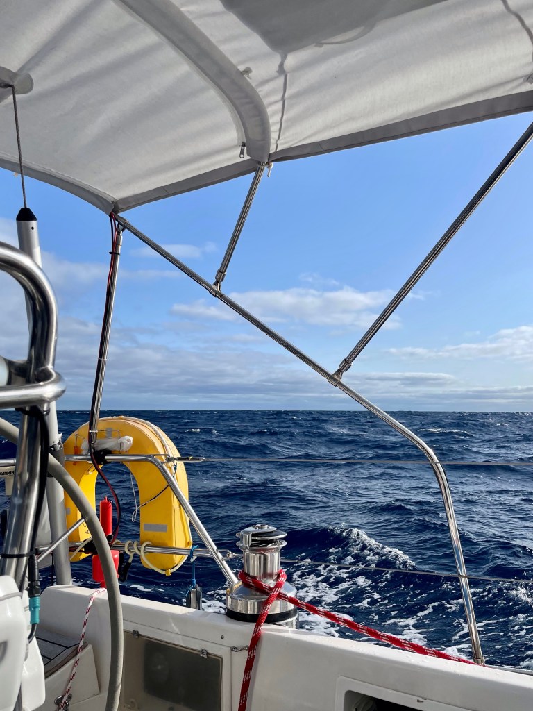 Täytyy myös mainita, että täällä on vaihteeksi kaksi satamakissaa! Toinen pieni mustavalkoinen laiheliini, joka hengaili satamatoimistossa tai sen läheisyydessä, ja toinen hyväkuntoinen harmaaraitainen, joka taas tuntui majailevan satamakapakan kulmilla. Tankkauksen jälkeen pääsimme siis jatkamaan matkaa kohti Kanarian saaria. Tuuli oli mukavaa slööriä noin 10–20 solmua. Nostimme heti alkuun pelkän ison genuan ja asetuksia ei kauheasti tarvinnut matkan aikana muutella, niin tasaisena tuuli pysyi. Teneriffan kulmalla sunnuntaiaamuna tuuli sen verran siftasi, että Maria pääsi tekemään yhden jiipin. Maininki tuli sivusta, joten jonkin verran keikkumista oli tarjolla. Madeira katosi horisontista pilveen noin 5 tunnin purjehduksen jälkeen ja sen jälkeen näimme vielä Desertassaaret melko pitkään. Selvagenssaaria sen sijaan emme nähneet tähystelystä huolimatta, ilmeisesti ne ovat sen verran matalammat. Laivoja ei näkynyt ennen kuin Teneriffan ja Gran Kanarian välisellä laivaväylällä ja purjeveneitäkin vain alussa ja lopussa AIS:ssa. Mitään mereneläviäkään ei valitettavasti muutamia suulia(ei vieläkään albatrosseja) lukuun ottamatta näkynyt eli rauhassa saimme olla ja ehdimme lueskelemaan ja kuuntelemaan äänikirjoja sydämemme kyllyydestä.