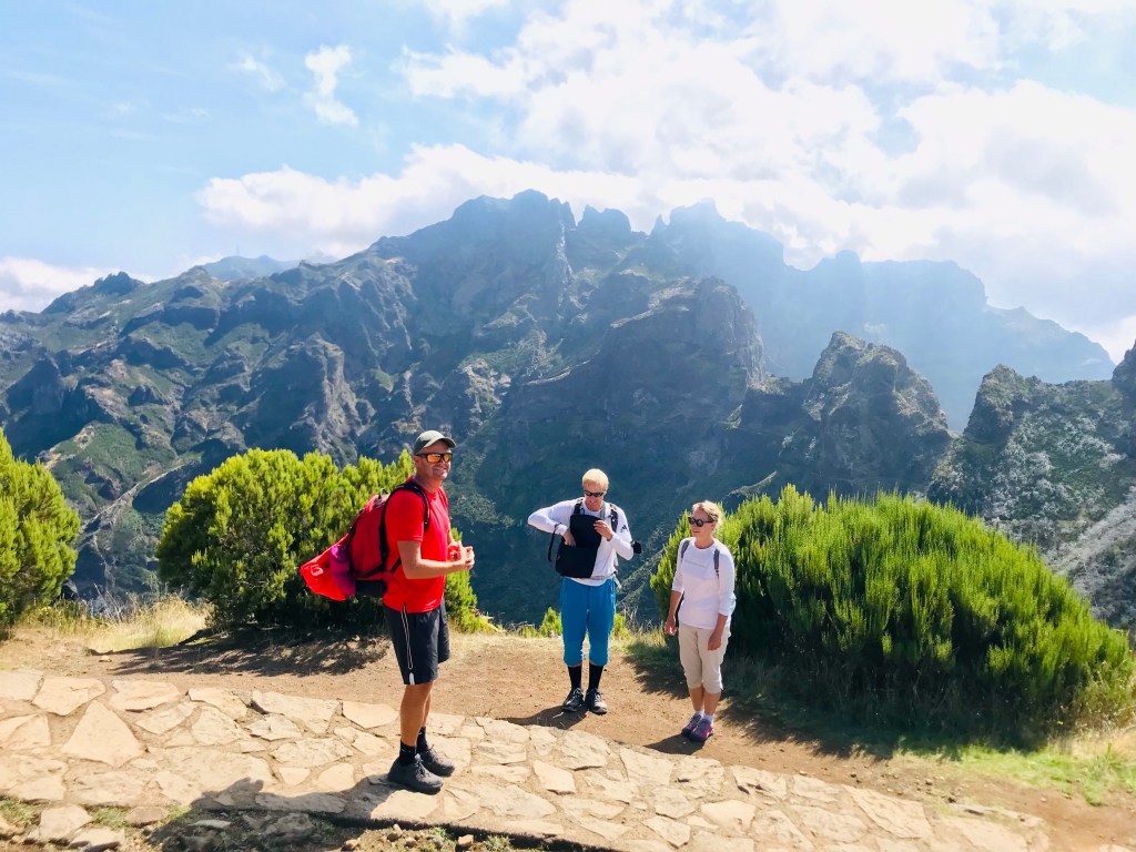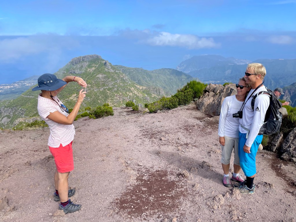 Reitti näytti olevan suosittu, mutta meillä oli oikein hyvä ajoitus, sillä suurin osa porukasta oli jo tulossa alaspäin vuorelta. Reitti oli luokiteltu AllTrailsissa vaikeaksi, mutta se oli lopulta helppokulkuista kivettyä polkua suurimman osan matkaa, korkeuseroa löytyi kuitenkin jonkin verran erityisesti loppumatkasta. Polulta oli huikeat vuoristoisen maisemat ja taivas oli pääasiassa pilvetön onneksemme. Matkalla oli tietysti myös Madeiralaiseen tyyliin kahvila jo melko korkealla rinteessä pelkän polun varressa ilman tieyhteyttä. Mitenkähän mahtavat kuskata paikalle kaikki myytävät tuotteet? Pääsimme huipulle ongelmitta ja meidät palkittiin mahtavilla panoraamamaisemilla kaikkiin ilmansuuntiin. Huipulla ihasteltiin vähän maisemia, haukattiin evästä ja hengähdettiin ja sitten lähdettiin samaa reittiä alas. Kaikilla oli vielä voimia jäljellä, joten päätimme kulkea hetken matkaa edestakaisin toista vaellusreittiä, joka ristesi polkumme kanssa. Tämä reitti olikin sitten vähän hurjempaa ja kulki paikoitellen kapealla kalliojyrkänteellä. Rinteissä näkyi osittain hiiltyneitä kuolleita puunrunkoja muistuttamassa aiemmista metsäpaloista. Eläimistöstä näimme taas paljon sisiliskoja ja jonkun tuulihaukan.