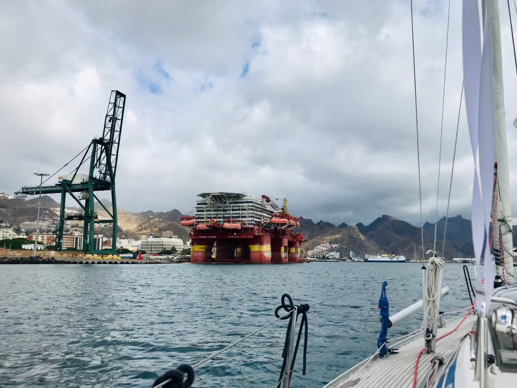 Miehistökin pysyi tällä kertaa terveenä koko matkan. Jälkimmäisenä yönä pimeän juuri laskeuduttua Maria näki vahtivuorossaan erikoisia strobovaloja noin 60 Nm Teneriffasta pohjoiseen veneen molemmilla puolilla. Ajoimme noin 20 m päästä yhdestä valoista, jossa oli sekä valkoista että punaista, mutta valojen alkuperä jäi silti epäselväksi. AIS:ssa tai kartassa ei näkynyt kerta kaikkiaan mitään, joten paras veikkaus oli, että voisiko kyseessä olla jotain valaistuja kalastusvälineitä? La Palman tulivuorenpurkausta ei sen sijaan millään tavalla näkynyt. Teneriffan valot alkoivat näkyä yöllä jo varhain ja aamun valjetessa saari tuli näkyviin. Teiden tulivuori ei näkynyt, koska saari oli pilven ja tihkusateen ympäröimä. Sadepilviä tuli meidänkin päällemme ja saimme maanantaina aamupäivällä sadekuuroja niskaamme. Sateen mukana tuli kannelle ja istumalaatikkoon myös jotain mustaa sotkua. Mahdollisesti kyseessä voisi olla tulivuoren tuhka, koska sadepilvet tulivat La Palmalta päin. Matkalla vähän tarkoituksella hidastelimme, jotta emme tulisi Santa Cruzin satamaan pimeällä. Hidastelu oli kuitenkin lopulta turhaa, koska toisena yönä tuuli heikkeni aamuyöllä niin, että vauhti oli ajoittain vain 3–4 Kn. Olimme sähköpostilla varanneet edeltävästi paikan Santa Cruzista ja saimme köydet kiinnitettyä noin kahden vuorokauden purjehduksen jälkeen maanantaina klo 12. Purjehduksen ruokapuolesta pitää mainita tällä kertaa, että Maria kokeili ensimmäistä kertaa leipoa leipää veneen uunilla. Kokeilussa oli yön yli kohotettava focaccia. Leivästä tuli lopulta oikein hyvää, vaikka loppukypsennys jäikin vähän herran haltuun satamamanööverien takia ja leivästä tuli hivenen kuivahko. No viimeistään Atlantilla saamme aiheeseen lisäharjoitusta.