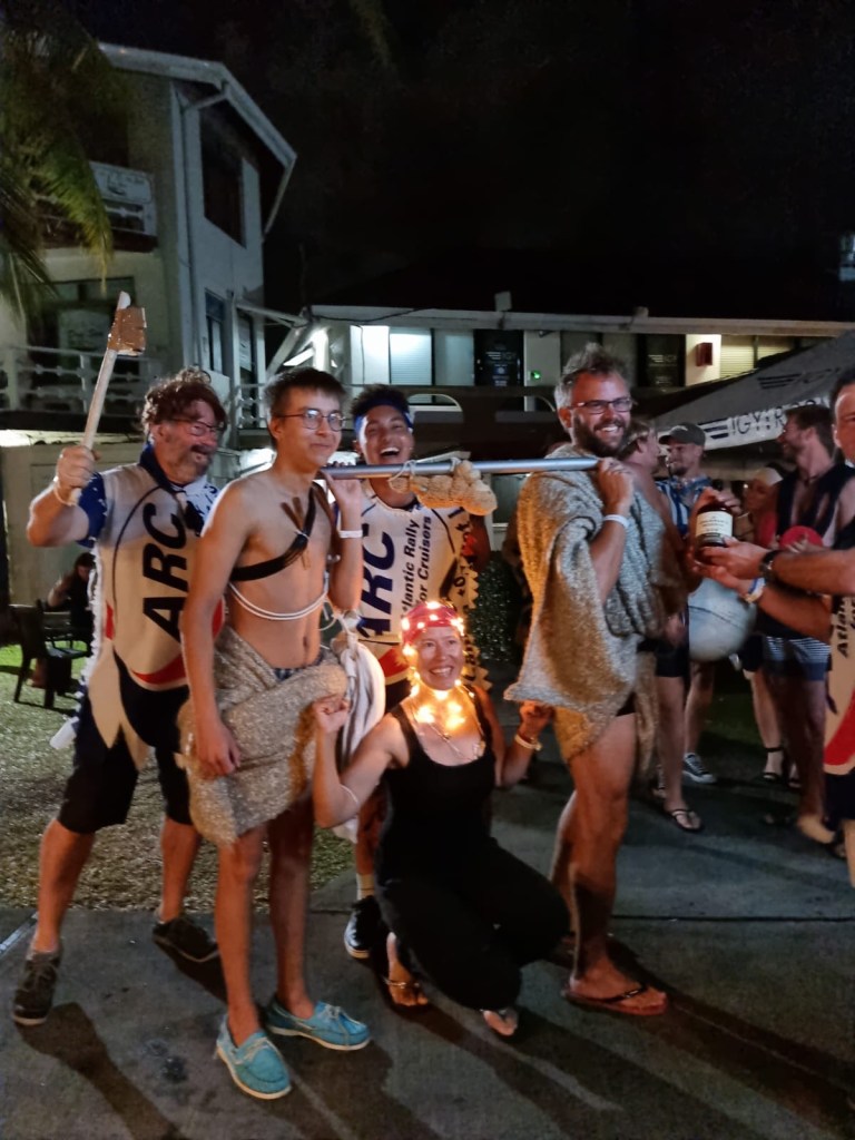 Illalla oli vielä ohjelmassa ARC:n järjestämät naamiaiset teemalla kivikausi. Maria oli viimeiset päivät miettinyt kuumeisesti meille pukuja. Las Palmasissa läksiäisjuhlissa oli ollut teemana Karibia ja emme sinne keksineet oikein mitään pukuja ja se harmitti, joten nyt oli revanssin aika. Meillä on veneessä Ikean pörröiset vaaleanruskeat torkkupeitot, jotka saivat nyt käydä turkiksista. Väinö ja Tapio pukeutuivat niihin esittäen kivikauden miehiä. Marialle oli hiukan vaikeuksia keksi pukua, mutta lopulta hän sai esittää kivikauden miesten tekemää tulta pukeutumalla mustiin vaatteisiin ja kietomalla päähän patterikäyttöiset jouluvalot. Köytimme vielä tassuista vartaaseen Marian Belgiasta tuliaiseksi saadun uninallen, joka sai nyt esittää metsästettyä luolakarhua, joka oli ripustettu nuotion yläpuolelle vartaaseen paistumaan. Pukumme herättivät vieraissa ansaittua huomiota ja saimme poseerata monissa kuvissa ja myöskin lipukkeet ilmaisiin juomiin. Voitimme lopulta parhaiten pukeutunut miehistö – palkinnoksi taas uuden pullollisen rommia. Oli hauska ilta.