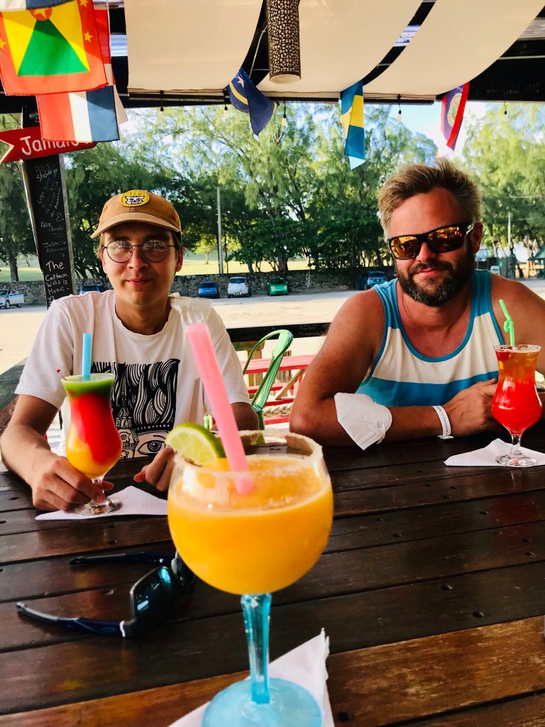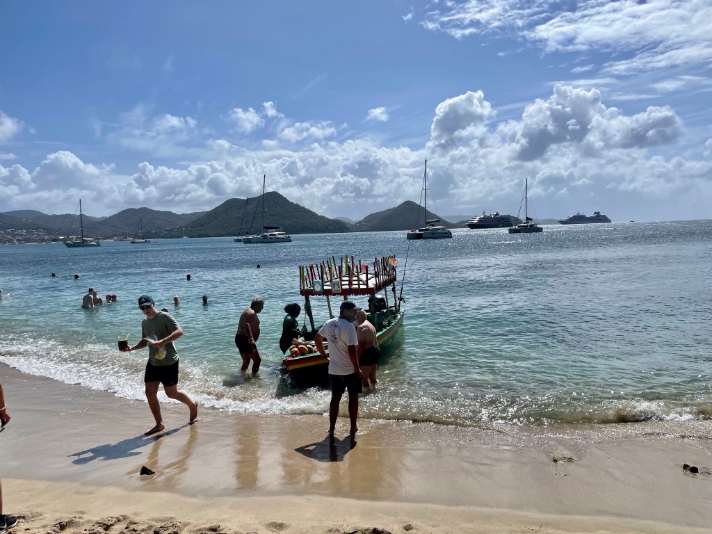 Rannalla oli myös läheiseltä pieneltä risteilyalukselta tuotuja risteilymatkustajia aurinkotuoleissaan. Heitä varten oli rannalle tilattu soittamaan steel pan-bändi, josta mekin pääsimme siinä sivussa nauttimaan. Heillä oli myös lounastarjoilu järjestettynä rantaan. Hetken ajan mietimme, saisimmeko mekin ruokaa, jos vain menisimme jonon jatkoksi. Emme kuitenkaan uskaltaneet yrittää vaan ostimme rantaan veneellä tulleelta hedelmäkauppiaalta mangoja välipalaksi. Tarjolla olisi ollut myös muun muassa ananaksia tai kookospähkinöitä rommilla ja olutsankoja paikallista Piton-olutta, mutta ne skippasimme.