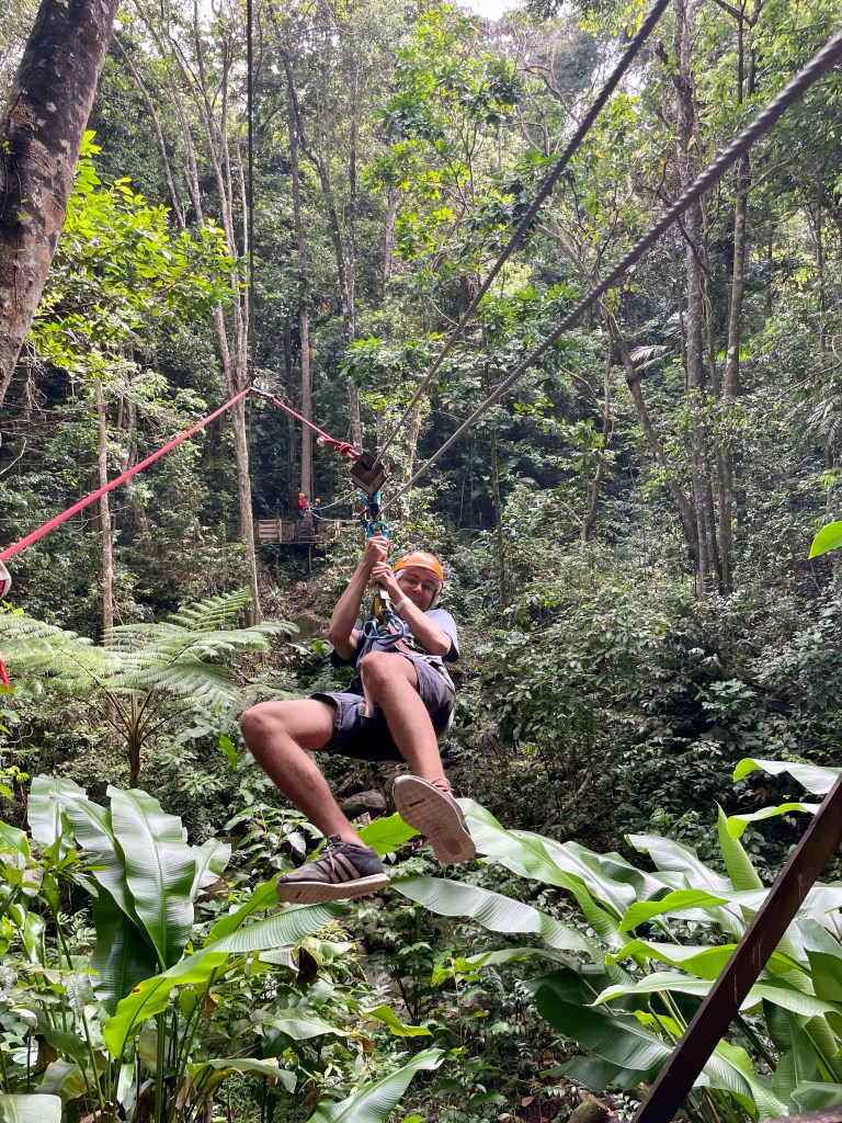 Toinen turistipäivä. Tänään ohjelmassa oli retki viidakkoon saaren keskiosaan köysiliukuihin. Kuljetuksemme saapui 9:20 hakemaan meidät satamasta ja ajelimme tilataksilla parin hotellin kautta paikallisen asutuksen läpi viidakkoon rakennettuun elämyspuistoon. Hotelleista tuli kyytiin lisää väkeä. Seurasimme huvittuneina paikallisen koronaprotokollan helmiä. Kuskimme ajoi taksillaan sisään erään hotellin porteista. Portilla oleva vartija kyseli häneltä yhteystiedot kaavakkeeseen, mittasi ranteesta lämmön ja suihkautti käsidesiä. Sitten ajoimme ympyrän hotellin pihassa ja otimme kyytiin kaksi ihmistä. Parin minuutin kuluttua ajoimme ulos toiselta puolelta porttia, jossa kuskiltamme taas mitattiin lämpö ranteesta. Ei ollut ilmeisesti kahden minuutin aikana noussut kuumetta, kun pääsimme jatkamaan matkaa. Ajomatkalla oli ihan mielenkiintoista katsella ikkunasta paikallisia maisemia. Asutus näytti olevan aika huonokuntoista ja teiden varsilla oli liassa laiduntamassa vuohia ja lehmiä. Noin 45 minuutin ajon jälkeen saavuimme kohteeseen viidakkoon. Siellä jätimme reput säilytyslokeroon ja puimme henkilökunnan avustuksella päälle kiipeilyvaljaan ja kypärät ja läksimme kävelemään viidakkoon. Sinne oli rakennettu eri korkeuksille 16 lavaa, joiden väliin oli tehty köysirata, jota pitkin olisi tarkoitus liukua radalta toiselle.