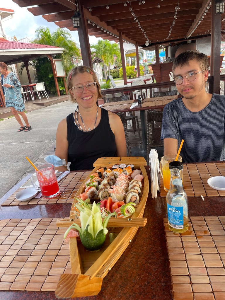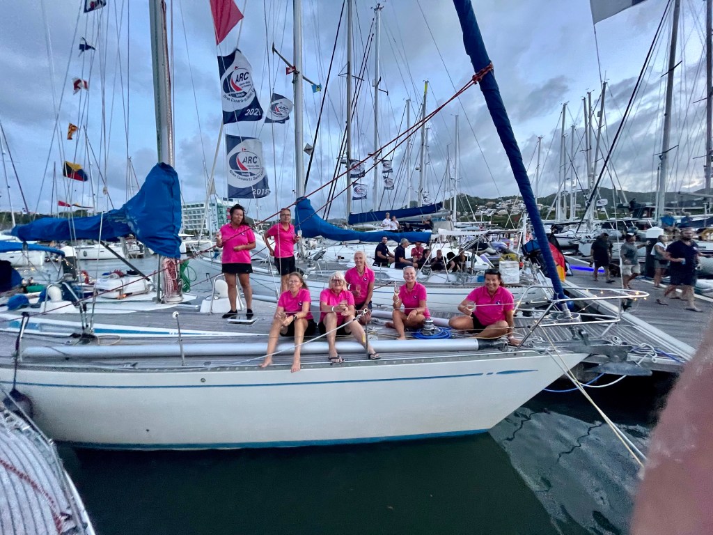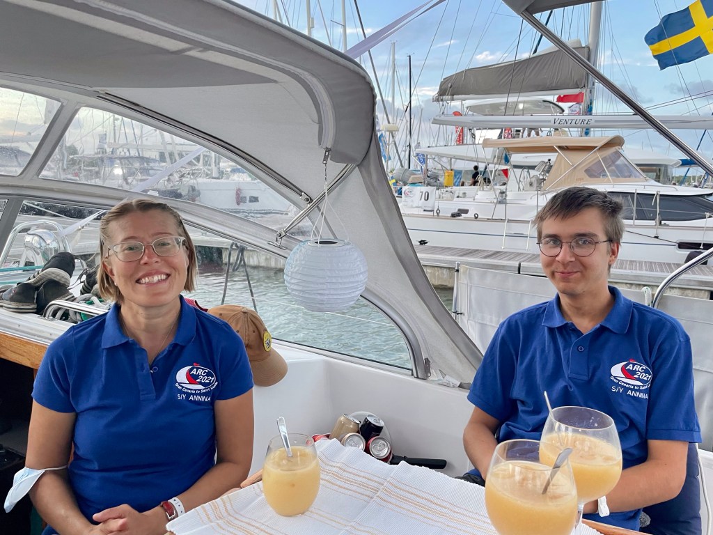 Aamulla toimistojen avauduttua kiirehdimme tuloprotokollan mukaan ensin koko miehistö terveystoimistoon. Siellä suojavarusteisiin pukeutunut sairaanhoitaja mittasi koko miehistöltä lämmöt ranteesta infrapunamittarilla ja tarkisti koronarokotustodistuksemme. Sen jälkeen saimme valkoiset rannenauhat merkkinä saaduista rokotuksistamme ja saimme luvan liikkua saarella. Tämän jälkeen kapteeni riensi satamatoimistoon, tulliin ja imigrationiin tekemään loput maahantulovelvollisuudet. Nämä hoituvat melko nopeasti ja sen jälkeen menimme satamassa auki olevan ravintolan terassille aamupalalle. Ai että kylmä mango-passionhedelmäsmoothie ja pekoni maistuivat hyvältä! Suihkuun teki mieli, mutta kapteenin määräyksellä teimme veneessä ensin raivausta ja siivousta saadaksemme veneen taas satamamoodiin ja tietysti tuli myös vertailtua ARC-tuttujen kanssa ylityskokemuksia. Iltapäivällä pääsimme siihen odotettuun suihkuunkin lopulta ja lämmintä vettäkin tuli. Tulopäivänämme sattui olemaan pyhäpäivä, St. Lucian kansallispäivä. St. Lucialla on koronatilanteen takia voimassa ulkonaliikkumiskielto arkisin ja lauantaisin klo 22–04 ja sunnuntaisin ja pyhinä klo 17–04. Eli tulopäivänämme kaikki kaupat ja ravintolat olivat menossa ajoissa kiinni. Läksimme iltapäivällä kuitenkin kävelemän noin kilometrin päässä olevaan Rodney Bayn kylään tarkoituksena käydä kaupassa ja syömässä. Ruokakaupat ja ravintolat menivät kuitenkin kiinni ennen kuin ehdimme niihin ja palasimme satamaan ajatuksella, että täytynee jatkaa veneessä säilykkeiden syömistä vielä yksi ilta. Osoittautui kuitenkin, että sataman alueella sijaitsevat ravintolat eivät olleet yhtä tiukkoja karanteeniaikojen kanssa kuin kylän ravintolat. Suurin osa ravintoloista näytti olevan auki. Pysähdyimme sushiravintolan kohdalle kyselemään, voimmeko saada sushia mukaan, mutta saimmekin lopulta syödä ihan ravintolassa terassilla. Sushi maistui kyllä hyvältä. Sitten painelimmekin nukkumaan korjaamaan edellisen yön univelkoja. Kyllä tuntui hyvältä nukkua puhtaissa lakanoissa peräkajuutan Tempur-patjalla kaikkien nihkeissä lakanoissa meripunkassa vietettyjen öiden jälkeen.