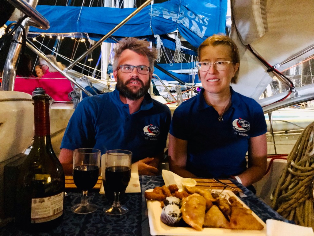 Illalla oli vielä Rodney Bayn sataman päällikön järjestämät tervetuliaisjuhlat ARC-veneille. Kaikki veneet saivat lahjakassit, joissa oli paria eri paikallista maustekastiketta ja jälleen pieni pullo paikallista rommia. Sataman baarin edustalla oli paikallinen bilebändi soittamassa ja tarjolla oli kuinkas muuten kuin rommipunssia. Juttelimme illan ruotsalaisten tuttujemme kanssa ja tutustuimme myös englantilaiseen pariskuntaan, jotka olivat tulleet maihin meidän jälkeemme kärsittyään autopilottiongelmista merellä. Meno osalla vieraista oli varsin vauhdikasta, me sen sijaan olimme suht koht rauhallisesti ja menimme nukkumaan ajoissa ilman jatkoja.