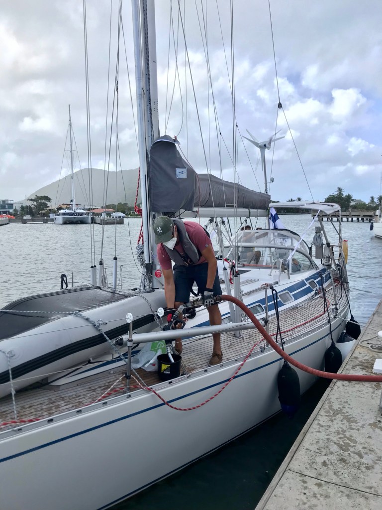 Tiistaina ulkoistimme veneen ulkopuolen kuurauksen paikalliselle pariskunnalle, jonka olimme maanantaina nähneet kuuraavan toisella puolellamme olevaa puolalaista venettä. Mies oli kuvitellun stereotyyppinen paikallinen mies rastoissa, jamaika-shortseissa ja hän lauleskeli kuuratessaan täydellä teholla Bob Marleytä. Hän kertoi, että heidän kotinsa oli tuhoutunut edellisessä hurrikaanissa ja he yrittävät kerätä rahaa uuden talon hankintaan. He kuurasivat kaikki metalliosat, jotka olivat suolaisen merimatkan aikana keränneet melkoisesti ruostetta, ja pesivät kannen. Jälki oli erinomaista. Me kävelimme sillä välin Rodney Bayhin kauppaan ja kävimme KFC:llä syömässä kanaa. Sää St Lucilla on helteinen. Lämmintä on päivisin noin 30 astetta, joskin jatkuva tuuli viilentää mukavasti. Sadekuuroja tulee joinakin päivinä aika tiheään ja ne alkavat ja loppuvat äkisti. Yöllä lämpötila laskee 20 korville. Vesi on 25–26 asteista. Satama-allas on tosin sen verran likainen, että uimaan veneen perästä ei tee mieli.