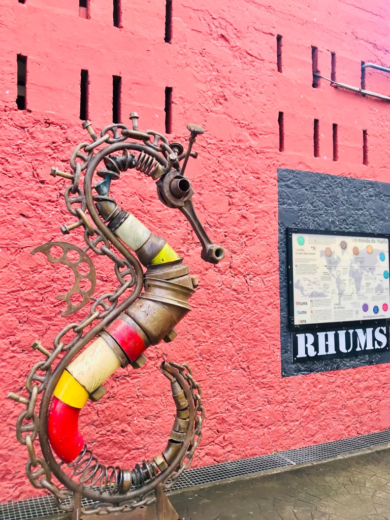 Matkalla ohitimme yhden saaren lukuisista rommitislaamoista ja päätimme poiketa sinne. Kiertelimme pihassa ja rakennuksissa, joissa oli rommintuotanto menossa. Kaikki opaskyltit olivat ranskaksi, joten vierailun anti rajoittui lähinnä pihan ja rakennusten ihailuun. Emme viitsineet myöskään mennä maistelutiloihin, koska Tapion pitäisi kuitenkin olla ratissa päivä. Rommia pitäisi ostaa, mutta se tehtäisiin marketista. Kun selvisimme pihatiellä auton edessä juoksentelevista kanoista, jatkoimme matkaa pohjoiseen. Kolmas pysähdys tehtiin Saint-Pierren kaupungissa. Kaupungin vieressä kohoaa 1397 m meren pinnan yläpuolelle Mount Pelée, aktiivinen tulivuori. Kaupunki ja vuori ovat surullisenkuuluisia 8.5.1902 tapahtuneesta purkauksesta, jonka yhteydessä vapautuneeseen pyroklastisen tuhkapilven purkautumiseen kuoli silmänräpäyksessä kahta lukuun ottamatta koko kaupungin 28 000 suuruinen väestö. Tuhkapilven vuoksi upposi myös 20 kaupungin edustalla ankkurissa ollutta laivaa. Jätimme auton parkkiin kaupungin laidalla olevalle pysäköintialueelle ja kävelimme koko kaupungin edustalla olevaa mustaa laavahiekkaista hiekkarantaa pitkin keskustaan. Useita rakennuksia ihan kaupungin keskustassa näyttää edelleen olevan raunioina ja enemmän tai vähemmän mustuneita. Kello alkoi näyttää lounasaikaa, joten poikkesimme ensimmäiseen vastaan tulleeseen ravintolaan, joka mainosti rantaterassia. Terassi olikin lähes tupaten täynnä lounastamassa olevaa väkeä. Hyvä merkki. Koronapassien näyttämisen jälkeen saimme kuin saimmekin pöydän, vaikka meillä ei ollut varausta. Tarjolla olisi ollut myös herkullisen kuuloinen kokin suositusmenu, mutta koska emme olleet vielä kovinkaan nälkäisiä, tyydyimme yksittäisiin pääruokiin. Tapio tilasi grillattua kalaa, Maria naudanlihapataa. Ruoka tuli melko pikaisesti ja molempien annokset olivat herkullisia. Marian naudanliha oli luullista ja aivan pehmeäksi kypsynyttä, Tapion kala mehevää. Ruokien hinnatkin olivat varsin kohtuulliset, 15–16 €/annos. Parasta ruokaa, mitä tähän mennessä olemme Karibialla ravintolassa syöneet.