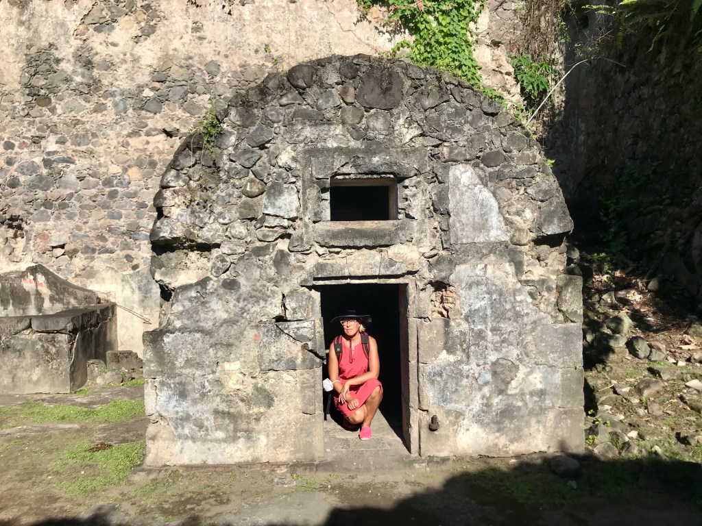 Viihdymme Saint-Pierren edustalla ankkurissa emmekä pitäneet kiirettä eteenpäin. Päivällä hyppäsimme Kikkaan ja jollailimme kylän jollalaituriin aikomuksenamme selvittää, onko mahdollista saada autoa vuokralle ja yrittää uutta Mount Peléen valloitusta. Kylässä oli Google mapsin perusteella neljä autovuokraamoa, joita rupesimme etsimään. Kaikki osoittautuivat suljetuiksi, mitä tahansa netissä oleviin aukioloaikoihin oli kirjattu. Kiertelimme samalla muutenkin kylällä katsomassa vuoden 1902 tulivuorenpurkauksen raunioita ja niistä ajoista kertovia opastauluja. Kävimme mm. jo ennen purkausta suljetun teatterin raunioissa ja löysimme myös sen vankikopin, jossa purkauksesta toisena ihmisenä hengissä selvinnyt vanki oli kärsinyt tuomioitaan. Seinät olivat kyllä kopperossa sen verran paksua kiveä, että kyllä koppi on varmasti ollut kylän turvallisin paikka. Monet ravintolat ja kaupat olivat suljettuja. Kylässä hauskaa oli, että vuohia ja kanoja kuljeskeli lähes kaduilla. Kylässä oli myös kohtalaisen hyvä ruokakauppa ja päädyimme ostamaan illalliseksi savustetun kanan ja pakasteranskanperunoita. Niistä syntyi varsin mainio illallinen, jota nautittiin täysikuun loisteessa. Illalla lähetimme vielä Whatsupilla viestin yhteen kylän autovuokraamoista, jolla oli kaksi toimipistettä ja kyselimme autoa vuokralle. Ihmeeksemme saimme englanninkieliseen viestiimme vastauksen, mutta yhtään autoja ei valitettavasti ollut vapaana. Se siitä Mount Peléen valloituksesta.