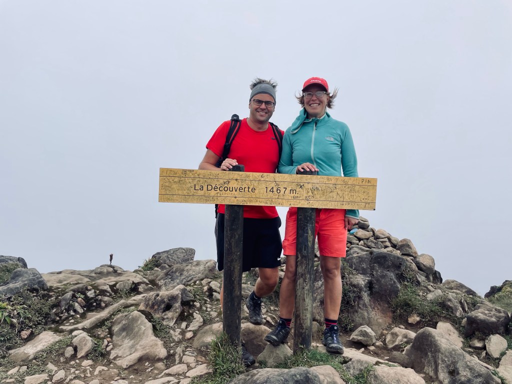 Ihmisiä oli liikkeellä paljon ja polku kapeni kapenemistaan. Saimme tuon tuostakin väistellä muita kulkijoita ja bonjour tuli sanottua vastaantulijoille aika monta kertaa. Kasvillisuus muuttui pensaikoista vielä matalammaksi. Kaikkialla kasvoi rahkasammalen näköistä punertavaa sammalta, joka sai maan näyttämään upealta. Pian tulimme risteykseen, josta pääsi huipulle. Risteyksestä olisi päässyt toista reittiä myös katsomaan fumaroleja, mutta se reitti oli suljettu fumarolien lisääntyneen aktiivisuuden ja niiden tuottamisen myrkyllisten kaasujen takia. Käännyimme siis huipulle päin. Tästä eteenpäin alkoikin jyrkempi nousu, jota piti monin paikoin edetä nelivedolla ja kieli keskellä suuta. Kivien välissä oli mutaisia kohtia ja yhteen mutalätäkköön, joka näytti kovalta kohdalta, Maria onnistui upottamaan koko oikean kengän. Onneksi on Gore-Tex. Pian olimmekin jo kyltillä, joka osoitti, että olimme saapuneet huipulle. Mitä, joko nyt? Eihän se reitti ollut ollenkaan niin vaikea ja rankka, kuin kuvittelimme.