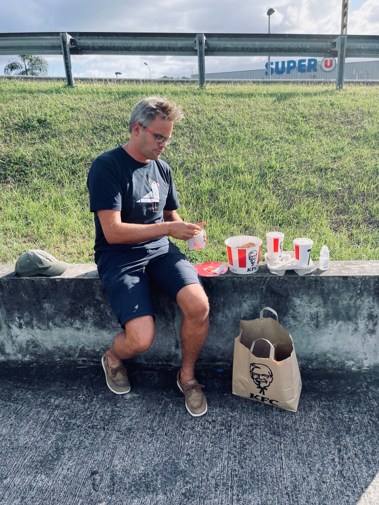 Matkalla olisi ollut eläintarha ja kasvitieteellinen puutarha, mutta ne skippasimme, kun olimme käyneet vastaavissa Martiniquella. Maisematien päästä löytyi Tapion pitkään himoitsema KFC ja pysähdyimme sinne syömään kanaa. Parkkeerasimme auton pysäköintialueelle, mutta jostain syystä paikassa oli avoinna vain autokaista. Sekään ei toiminut ihan perinteisesti, vaan kaistan alussa oli tilausmikrofonin tilalla työntekijä, joka näpytteli tilauksen tabletille. Saimme luvan mennä jalan autokaistaa pitkin jalan. Eipä ole tullut ennen kokeiltua. Saatuamme siipiaterian, menimme picnicille parkkipaikkaa ympäröivälle muurille. Siivet olivat OK, mutta Siipiweikkojen kastiketta tuli ikävä. Syönnin jälkeen menimme läheiseen isoon Carrefouriin täydentämään veneen ruokavarastoja. Paljon mitään ostettavaa ei pitänyt olla, mutta tulipahan sitä taas ostettua satasella ruokaa. Sen jälkeen olikin aika ajaa takaisin kotisatamaan tällä kertaa eri reittiä. Saavuimme perille vasta pimeällä. Onneksi tänään tuli suihkusta vettä vielä illalla ja suuntasimme suihkun kautta nukkumaan.