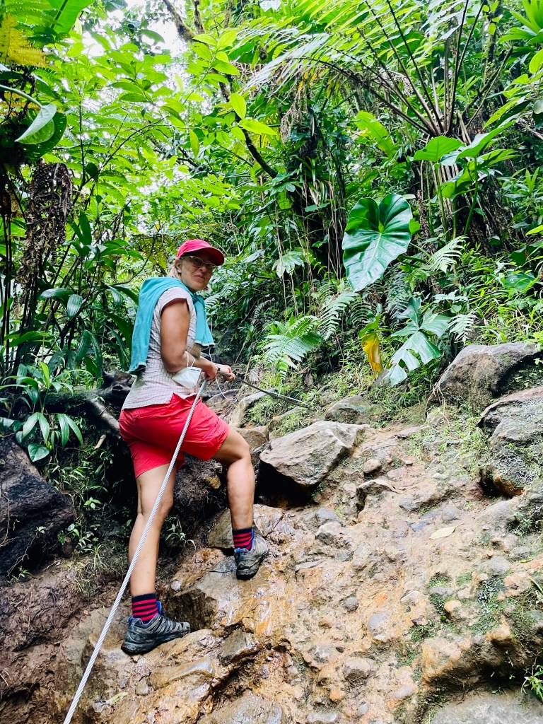 Reitin lähtöpisteessä oli kuumia lähteitä. Niiden yhteyteen oli tehty allas, jossa pääsi halutessaan kastautumaan lämpimässä vedessä. Altaan vieressä oli kuitenkin ameeboista varoittava kyltti, joka vei meiltä uintihalut. Reitti kulki alkuun kivettyä hyvää kävelytietä pitkin upeaa viidakkoa. Tie oli lievästi nouseva. Kun pääsimme riittävän korkealle, viidakko loppui ja kasvillisuus kävi matalammaksi. Pikkuhiljaa tie muuttui kapeammaksi poluksi, joka alkoi enemmän ja enemmän nousta. Taivaalla oli melko paljon pilviä, mutta välillä pilvet väistyivät ja saimme ihailla upeita maisemia merelle asti.