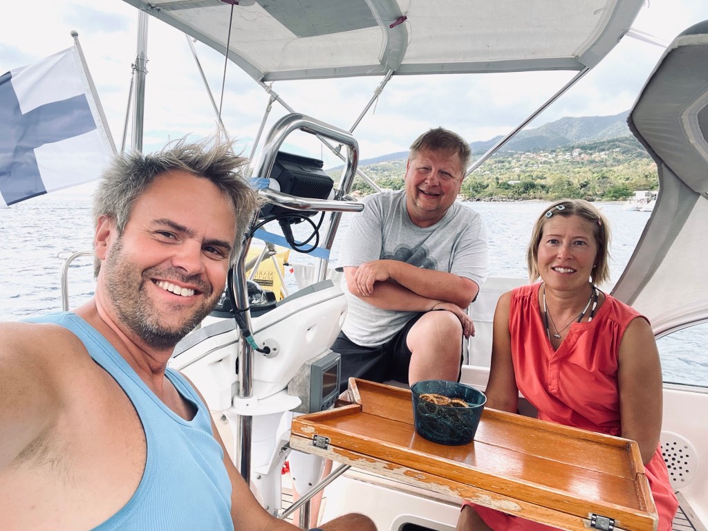 Olimme oikeastaan lauantaina jo suunnitelleet lähtevämme eteenpäin Deshaiesiin. Juuri kun olimme aamupäivällä järjestelemässä tavaroita lähtöä varten, Tapio sai kuitenkin yllättävän viestin myös Ännäläiseltä Tomi Huoviselta. Hän oli kuunari Helenan mukana miehistössä perämiehenä, ja he olivat myös tänään tulossa Pigeon Islandille. Emme olleet koskaan aiemmin tavanneet Tomia. Keväällä ennen lähtöämme oli ollut puhetta, että hän tulisi katsastamaan veneemme, koska hänellä oli paljon purjehduskokemusta isoilta meriltä. Silloin tapaaminen kaatui kuitenkin aikataulukiireisiin. Meillä ei ollut nyt vielä kiirettä lähteä eteenpäin, joten päätimme jäädä yhdeksi ylimääräiseksi yöksi paikoilleen, että saamme nyt tavata. Pian Helena lipuikin jo ohitsemme ja meni ankkuriin lahden toiselle puolelle. Tomi tuli poikkeamaan veneellä lasillisilla. Oli mukava tavata ja päästä puhuman Suomea.