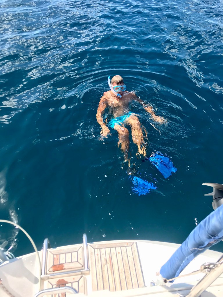 Lopun päivää elimme hiljaiseloa. Kävimme SUP-laudalla läheisellä poijulla snorklaamassa, koska olimme nähneet siinä käyvän paljon snorklaajia ja kartan mukaan lähistöllä piti olla jokin laivan hylky. Se oli kuitenkin niin syvällä, että emme nähneet siitä vilaustakaan. Vähän arveluttavia ilmakuplia pohjasta kyllä nousi. Päivälliseksi päätimme hakea eilisestä pizzeriasta kummallekin omat pizzat. Matka hoidettiin tällä kertaa Kikalla soutamalla, koska pizzeria oli ankkuripaikkaamme lähinnä olevan rannan vieressä. Tällä kertaa rupesimme molemmat kuitenkin hieman ahnehtimaan täytteiden kanssa ja valitsimme liian paljon täytteitä sisältävät lätyt. Pitäisi muistaa hyvässä pizzeriassa, että vähemmän on enemmän. Ensimmäisen illan Diavolo-pizza oli ehdottomasti rapeampi ja maukkaampi kuin nyt tilatut pizzat.