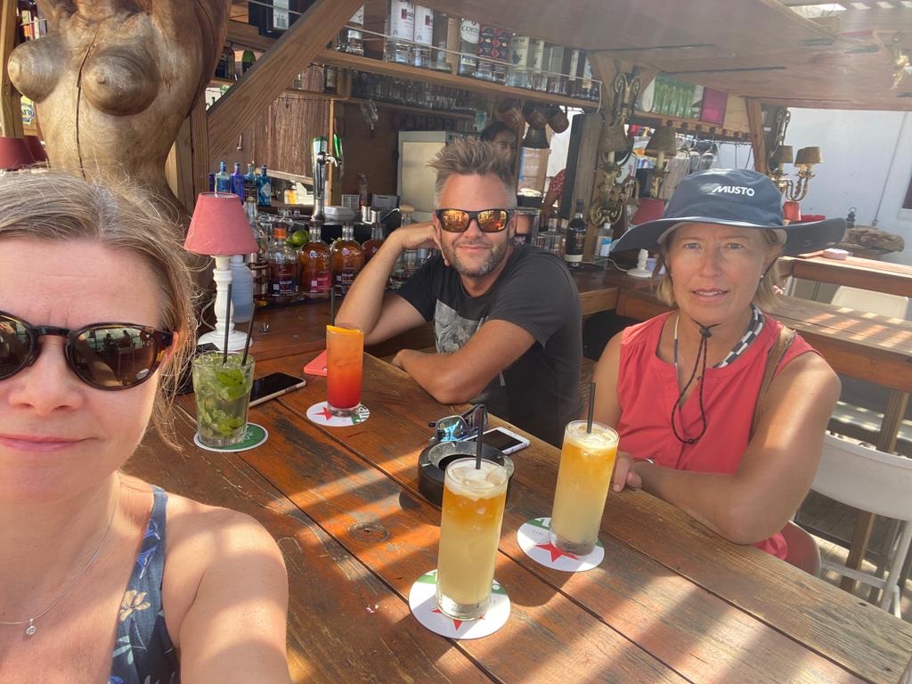 Tapio kävi taas aamulla ensi töikseen hakemassa leipomosta patonkia ja tuliaisena oli myös leivokset jaettavaksi. Sen jälkeen viimeistelimme vielä eilen aloitetut siivoushommat. Niinan ja Henriikan lento saapuisi iltapäivällä. Euroopassa oli luvassa myrsky, vähän saimme jännittää, ehtisikö kone ilmaan ennen pahimman myrskyn saapumista. Alkuillasta vieraamme pääsivät onnellisesti perille ja pikaisen vene-esittelyn jälkeen suuntasimme heti kauppaan hankkimaan ruokia saarikierroksellemme. Kaupassa oli loppuviikon kunniaksi hyllyt kiitettävän tyhjänä mm. kananmunat ja jugurtit ja kana loppu. Suurimman osan kauppalistan tuotteista saimme kuitenkin ostettua. Veimme ostokset veneelle ja suuntasimme syömään sataman läheisyydessä olevalle kattoterassille. Tarjoilija oli varsinainen show-mies, mutta ruoka ei ollut kovinkaan ihmeellistä. Miljöö oli kuitenkin oikein miellyttävä. Ruuan jälkeen olimme koko poppoo valmiita nukkumaan.