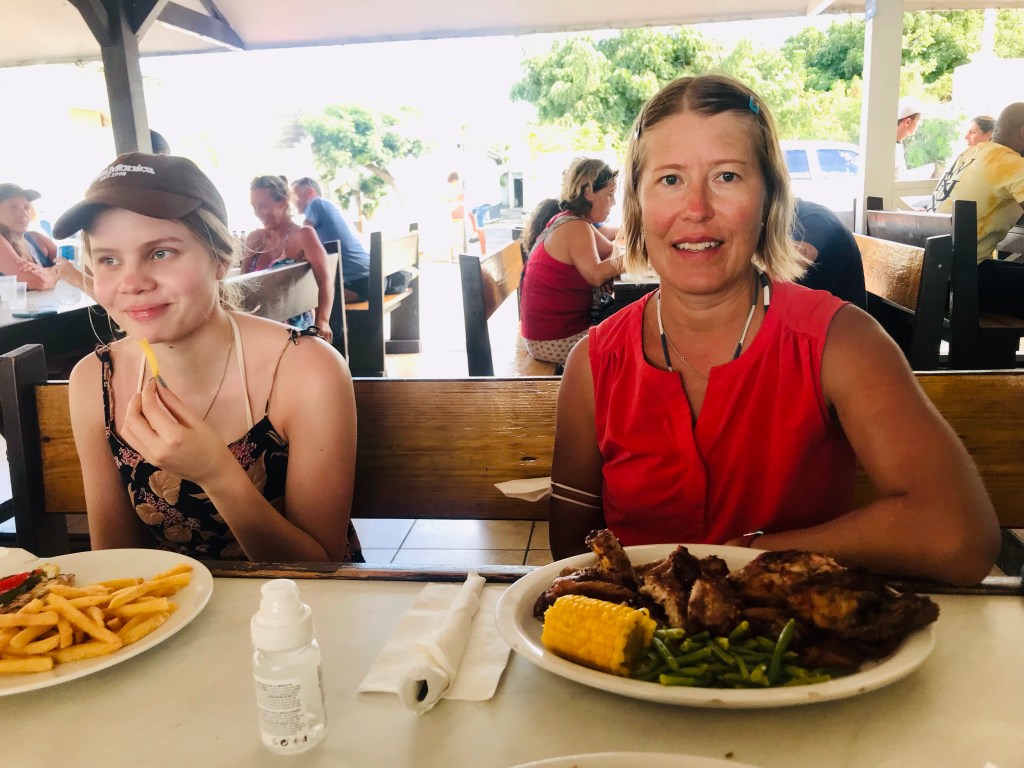 Pidimme siivouspäivää veneessä vieraiden tulon ja maasähkön kunniaksi ja imuroimme ja kuurasimme veneen pilssistä kattoon, keulasta perään. Aamupäivällä kävimme myös pyykillä kolmen pyykkikassillisen kanssa. Ensimmäisessä itsepalvelupesulassa tuli vesiperä, koska maksuautomaatti oli pimeänä. Onneksi toinen löytämämme pesula oli toiminnassa ja kaiken kukkuraksi ilmastoitu ja olimme ainoita asiakkaita. Tapio kävi pyykkien peseytyessä paikallisessa parturissa, joka leikkasi hiukset ja parran uuteen kuosiin pieteetillä hintaan 15 €. Tapio oli edellisenä iltana Super U-kaupassa käydessään nähnyt matkalla ruokarekkoja ja illalla menimme sinne katsomaan, saisimmeko ruokaa. Kärryn toiminta oli simppeliä. Edustalla oli puolikkaisiin tynnyreihin tehtyjä grillejä, joissa paistui kanaa ja ribsejä, joita myytiin lisukkeineen viereisestä ruokarekasta. Otimme yhden annoksen ribsejä, yhden annoksen kanaa ja lisäksi paikallisten miesten suosittelemia Johnny cakes-kakkuja. Kakut olivat litteäksi kaulittuja taikinakakkuja, jotka paistettiin upporasvassa. Maku oli suolainen, mutta hiukan makeutta oli mukana. Liha-annosten lisäkkeeksi sai valita kastikkeen ja lisäksi tuli kaalisalaattia. Ruoka oli hyvin grillattua ja herkullista. Limuineen annosten hinnaksi tuli 14 €, varsin kohtuullista. Saint Martinilla näyttää käyvän eurojen lisäksi tasapäisesti myös US-dollarit, joilla paikalliset näyttävät usein maksavan. Me pitäydyimme euroissa.