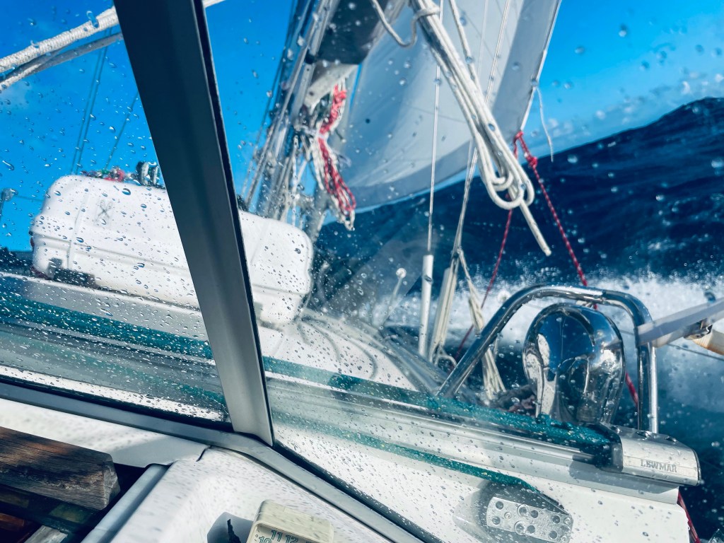 Vuorossa oli yritys numero 2 Antigualle. Herätyskello soi 5:00 ja aamupalan ja valmisteluiden jälkeen olimme ankkuri ylhäällä jatkamassa matkaa klo 7. Tiedossa oli tiukkaa luovia, mutta Predict Windin mukaan vendoja ei juuri tarvitsisi ottaa. Tuuli oli totutun äkäistä, keskituuli noin 24 Kn, puuskat 30 Kn. alkumatka päästiin ajamaan noin 60 asteen kulmalla kohti kohdetta. Muutama vene oli tulossa samaan suuntaan, vastaan tuli useampi 100 jalan hujakoilla oleva jahti, jotka olivat myös olleet ARC:ssa. Puolen päivän jälkeen kipparin ollessa päiväunilla pilvirintama meni yli ja sen seurauksena tuuli siftasi noin 30 astetta meille epäedulliseksi. Tämän jälkeen ajettiin niin ylös kuin päästiin. Aalto oli noin 2–3 metristä, joten meno oli melkoisen märkää. Keulan ankkurivinssin kolosta saatiin paljon vettä pilssiin, koska emme olleet irrottaneet ketjua ja suojanneet aukkoa. Päivä oli ihan totista purjehdusta, ruuaksi tehtiin vain nuudelikupit 30 astetta kallistuneessa keittiössä. Muuten syötiin vain banaaneja, sipsejä ja muuta naposteltavaa. Päivä oli kyllä todella pitkä. Varsinkin siltä tuntui illalla, kun Antiguan valot näkyivät jo kaukaa ja tikkasimme edustalla ja tuntui, että kohde ei yhtään lähene. Pimeän tultua risteilylaivatkin lähtivät tapansa mukaan liikkeelle ja jouduimme väistämään törmäyskurssilla ollutta Royal Clipper- nimistä 5 mastoista risteilykuunaria. Silmäluomet alkoivat painaa ja hermot alkoivat vähän jo kiristyä, kun Jolly Harbour ei alkanut lähentyä. Tuntui, että tuuli puhkui taas suoraan sieltä, mihin aioimme mennä. Lopulta laskimme purjeet ja jyrmyytimme koneella hissuksiin viimeiset mailit. Pääsimme perille noin yhden aikaan yöllä eli täysin pimeällä. Onneksi Jolly Harbourin edessä on iso matala ankkurialue, joten lääniä riitti valita pimeässä sopiva ankkuripaikka. Kun ankkuri oli saatu laskettua suurimmat vedet sisältä kuivattua, tehtiin vielä iltapalaksi pussista sienipastaa ennen pehkuihin painumista. Olipahan raskas purjehduspäivä, mutta Antigualla ollaan!