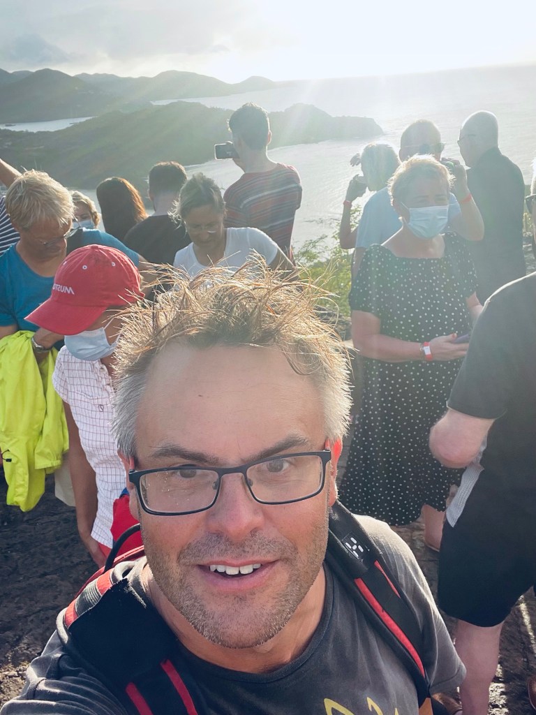 Trackerissa näytti siltä, että ankkuri pitää ja läksimme aiemman suunnitelman mukaan Hessun ja Sherylin kanssa maihin kiipeämään kohti Shirley Heightsin näköalapaikkaa, jossa oli ohjelmassa sunnuntai-iltana steelpan musiikkia ja grilliruokaa. Alkumatkan lampsimme tienlaitaa, mutta puolimatkassa päätimme kurvata samaan paikkaan menevälle polulle, ettei tarvitsisi kävellä autotiellä koko matkaa. Reitin merkinnät olivat hiukan puutteelliset ja eksyimme välillä reitiltä ja saimme myös sadekuuron niskaan. Bändin soittama musiikki kuului kuitenkin lähes koko kävelyn ajan. Lopulta kuitenkin löysimme polun uudelleen ja tupsahdimme pensaikosta Shirley Heighstsin näköalaravintolan pihaan, jossa oli jo pitkät jonot juoma- ha ruokapisteille ja bändi soitti täyttä häkää. Ehdimme haahuilla alueella jonkin aikaa ja käydä mm. ottamassa kuvat auringonlaskusta kuuluisalla näköalapaikalla. Vähän ihmettelimme, kun kaikilla muilla ihmisillä näytti olevan ranteessa vihreitä tai punaisia rannekkeita. Hetken päästä järjestyksenvalvoja tuli huikkaamaan meille, että meidän pitäisi tulla uudelleen sisään etuoven kautta ja maksaa sisäänpääsymaksu. Hups, olimme missanneet sen, kun tulimme pitkin polkua suoraan juhlapaikalla. Kiltisti menimme lipunmyyntipaikalle, mutta sinne oli varmaan 200 metrin jono, joka ei näyttänyt liikkuvan yhtään mihinkään. Lisäksi olimme jo nähneet, että sisäpuolella on todella pitkät jonot ruoka- ja juomatiskeille eikä pöytätilaa syödä. Niinpä päätimme, että jätämme jonottamisen väliin ja läksimme kävelemään takaisin alas tienlaitaa pitkin. Ihmisillä ei luultavasti ole Antigualla useinkaan tapana kävellä, koska monen monta taksia ja ihan tavallisiakin ihmisiä pysähtyi ja tarjosi kyytiä. Kaipasimme kuitenkin veneilyn jälkeen liikuntaa ja kävelimme sitkeästi alas. Ehdimme takaisin juuri kun alkoi pimentyä ja suuntasimme Sepin kyydissä takaisin veneelle.