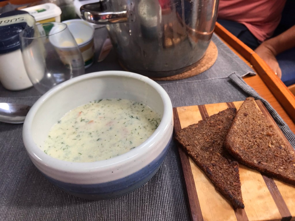 Heti kun tulimme Anninalle, huomasimme olevamme entistä lähempänä perässämme ollutta venettä. Matkaa oli ehkä 10 metriä. Trackeri näytti, että olimme välillä pysyneet paikallaan ja välillä ankkuri oli raahannut pohjassa. Eipä muuta, kun ankkuri ylös ja läksimme pimenevässä illassa etsimään toista ankkuripaikkaa. Koska alkoi jo olla pimeää, emme halunneet ahtautua mihinkään kapeaan väliin, vaan ajoimme vain lahden kaukaisimmalle laidalle eristäytyneeseen pisteeseen ja laskimme ankkurin uudelleen. Lahden pohja on Hessun tarkastuksen mukaan kiveä, vaikka karttaan on merkattu myös hiekkaa. Päivälliseksi tehtiin pitkästä aikaa kaksistaan, ruokalistalla oli halloumisalaattia. Sää ei ollut kummoinen. Sadekuuroja tuli edelleen vähän väliä ja tuuli oli sellaista, että sähköstä ei tullut pulaa. Yöllä heräilimme useampaan kertaan tarkistelemaan, että pysyimme tarpeeksi kaukana riutoista ja muista veneistä.