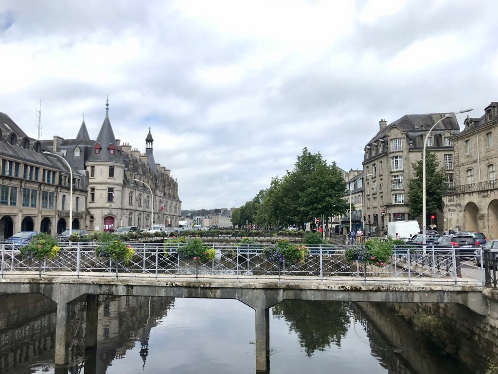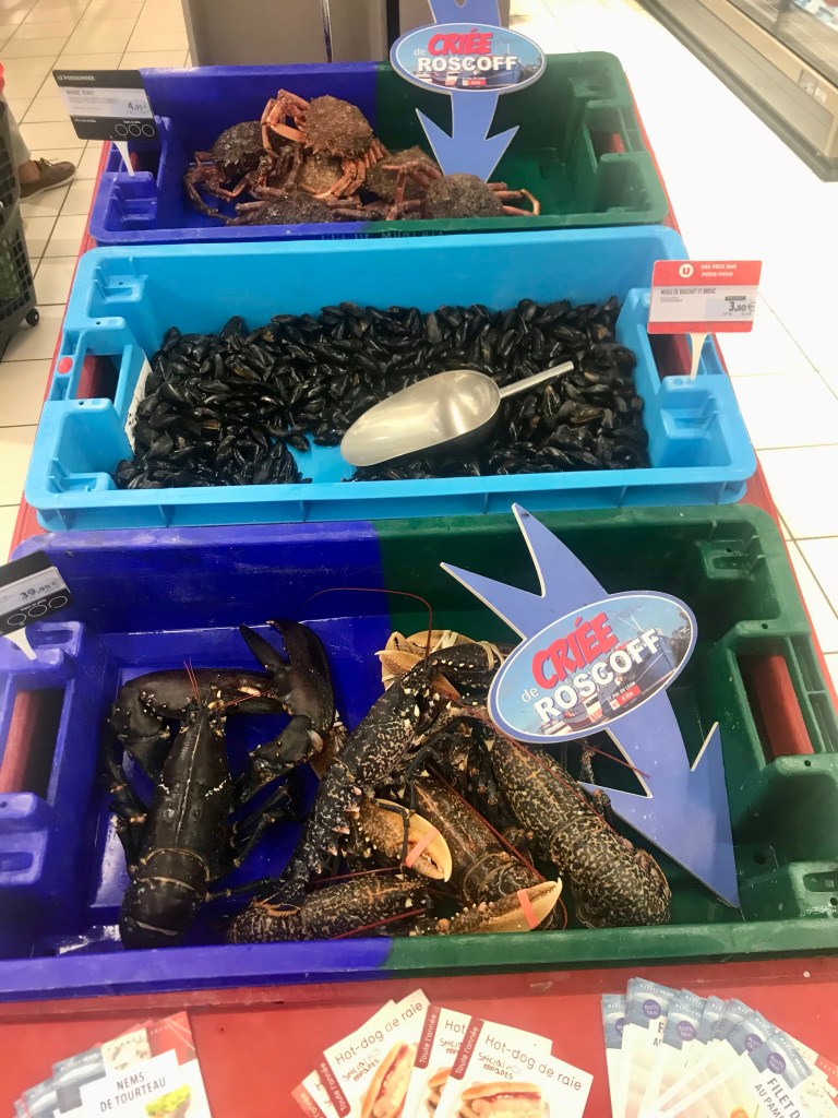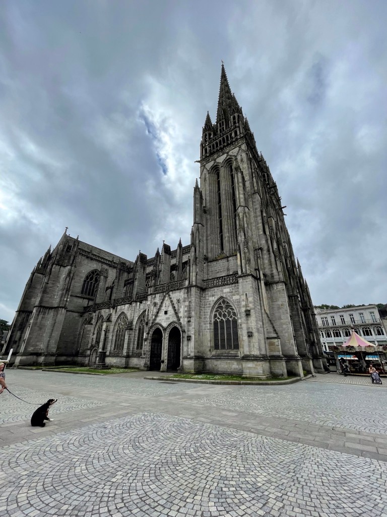 Aamulla heräsimme seitsemältä, että pääsemme ajoissa hakemaan vuokra-autoa. Nappasimme nopean pienen aamupalan ja läksimme läheisen lauttaterminaalin bussipysäkille odottamana bussia naapurikylään. Bussi tuli aikataulussa ja saimme itsemme kuskille ymmärretyksi. Matka kesti vain hiukan reilut 10 minuuttia. Täällä supermarketit harjoittavat muutakin toimintaa ja automme oli vuokrattu paikallisesta marketista. Heillä näytti olevan myös oma autokoulu. Saimme paperitöiden jälkeen alle pikkuisen Renault Twingon ja kurvasimme kohti noin sadan kilometrin päässä olevaa Quimperin kaupunkia. Tiet olivat kaikki todella hyvässä kunnossa ja hiljaisia. Maisemat olivat maaseutumaisia ja traktoreitakin oli liikenteessä vaikka kuinka paljon. Toinen toistaan söpömpiä kivitaloja kukkivine puutarhoineen oli teiden varsilla. Noin tunnin ajon jälkeen saavuimme Quimperiin, jätimme auton ilmaiselle pysäköintialueelle ja läksimme tutkimaan kaupunkia. Kävelimme aamun pitkin upeita katuja ja kävimme ihmettelemässä valtavaa Saint Corenthinin katedraalia. Lounaspaikaksi suunniteltu ravintola olikin kiinni, joten jouduimme etsimään lennosta uuden lounaspaikan. Pienen Googlauksen perusteella valitsimme Coté Bistrot. Siellä oli tarjolla 20,90 € hintaan tarjolla lounasmenu, johon kuului kahdesta vaihtoehdosta valittavat alkuruoka, pääruoka ja jälkiruoka. Valitsimme kumpikin eri vaihtoehdot, Tapio söi alkuun paikallista salaattia, johon oli lisätty pekonia ja paikallista makkaraa ja juustoa, pääruuaksi possua, paahdettuja perunoita ja kasviksia ja jälkiruuaksi suklaakakkua ja vaniljajäätelöä. Marian menulla oli kasvistartaria, pääruuaksi kalaa ja jälkkäriksi ananascarpaciota ja kookosjäätelöä. Todella maukasta, hyvistä aineksista tehtyä ruokaa! Kyllä ranskalaisten kelpaa.