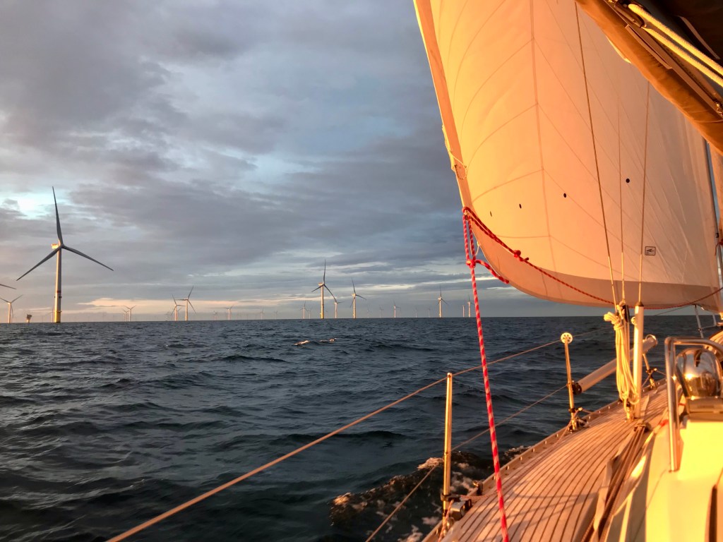 Vaikka koko matkalla laivaväylät kulkevat rinnalla, purjehdus oli pääasiassa rauhallista ja laivat eivät juuri häirinneet. Pahin kohta tällä kertaa oli Zeebruggeen menevän poikittaisen väylän edessä, mistä ei tahtonut löytyi hyvää purjehduslinjaa kaikkien satamaan pyrkivien -, luotsia odottavien ja ankkuroitujen laivojen, luotsiveneiden ja ruoppauskaluston sekä matkustuslauttojen keskeltä. Liikennekeskus kutsui meitä kertaalleen VHF:llä ja kehotti ajamaan pohjoiseen pois alueelta, vaikka olimme mielestämme laivaväylien välissä sillä hetkellä. Ajoimme pois alueelta hiljaisemman laivaväylän viertä valtavien tuulivoimalakenttien eteläpuolelta. Oli komea näky, kun aurinko laski tuulivoimalapuiston taakse ja voimaloiden valot alkoivat vilkkua.