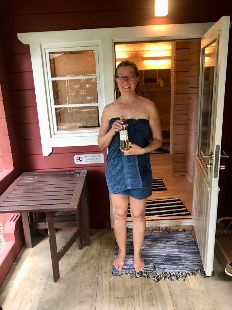 Sauna maistui makealle ja saunajuomaksi saatiin ostettua oikein Pommacit ja saunan jälkeen vielä kahvit, karjalanpiirakat ja korvapuustit. Merimieskirkon pappi ja sosiaalikuraattori olivat töissä, ja heidän kanssaan oli mukava vaihtaa kuulumisia. Mahtavaa, että tällainen paikka löytyy. Suosittelemme ehdottomasti kaikille purjehtijoille ja muillekin seudulla liikkuville suomalaisille. Kaupasta tarttui veneelle viemiseksi myös hernekeittoa, varrasleipää, Oltermannia ja pantterikarkkeja. Saunominen otti pitkän tauon jälkeen yllättävästi voimille ja juna- ja ratikkamatkan ja loppumatkan kävelyn jälkeen olimme kypsiä unille.
